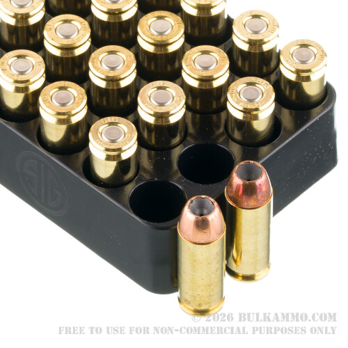 Any 10mm cartridge is already a force to be reckoned with, but when it sports SIG Sauer’s V-Crown projectile it’s a mighty solution for personal protection indeed. This round’s 180 grain projectile features a stacked hollow point design, which extends exceptionally deep within the core to enable wide expansion coupled with devastating energy release. The V-Crown’s jacket includes both skives and scores to ensure that such rapid expansion occurs along a uniform path. This bullet wears a toothed cannelure in the middle of its shank that binds its components together, ensuring the weight retention requisite for deep penetration as well. The result of so many features? Exceptional terminal performance, plain and simple.