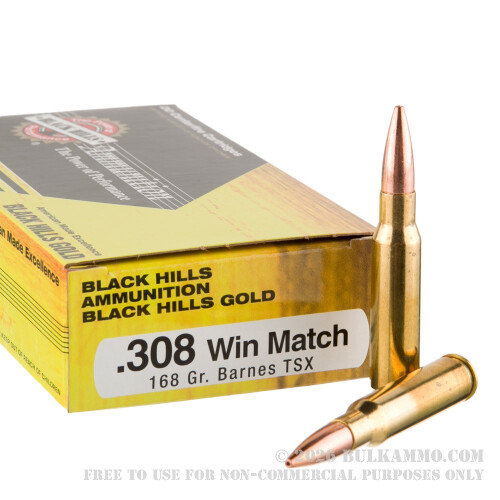 Combining a legacy of consistency and mainstream performance with an increased custom feature set to this ammunition, the Black Hills Gold .308 with a TSX projectile at 168 grains offers custom load development and super consistency. The round is a lethal hunting round with a special load quality allowing for highly tailored ballistics to suit your individual needs.