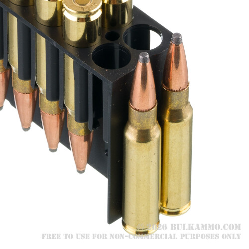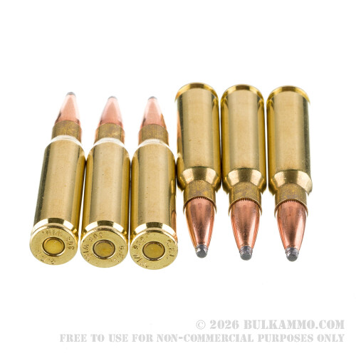 This round is loaded with an accurate 165 grain pointed soft point projectile. This spearlike bullet establishes a 0.435 ballistic coefficient the instant it rips out of a barrel, so it sticks to a flat trajectory until it hits your quarry with commanding energy. The soft point does a great job widening out to inflict massive wound trauma, and its tough jacket wards off much of the fragmentation that could cost serious points in terms of penetration depth.
