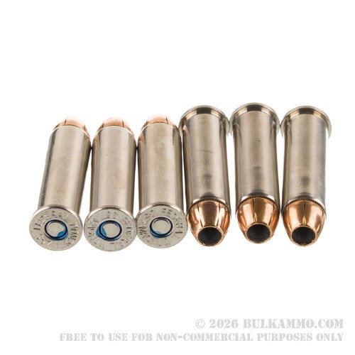 These rounds will strike a 25-yard target with 540 ft lbs kinetic energy when fired in a handgun with a 4” barrel. Whether you use it for defense or hunting, you can take added assurance that the ammo’s nickel-plated brass cases are shielded against tarnishing and smooth enough to reduce friction during feeding and extraction.
