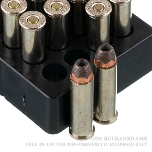 Remington’s High Terminal Performance line of ammunition is designed to maximize a handgun’s potential for personal protection (but you could certainly use this 357 Mag ammo for hunting if you’re a lever-gun fan). The bullet’s incomplete jacket keeps a firearm more accurate as it blocks lead residue from accumulating in the bore. The jacket’s wavy border enables the bullet’s lead nose cavity to expand to its fullest potential. The HTP SJHP consistently doubles in diameter during penetration – that means it can inflict a wound channel over 0.7” in diameter!