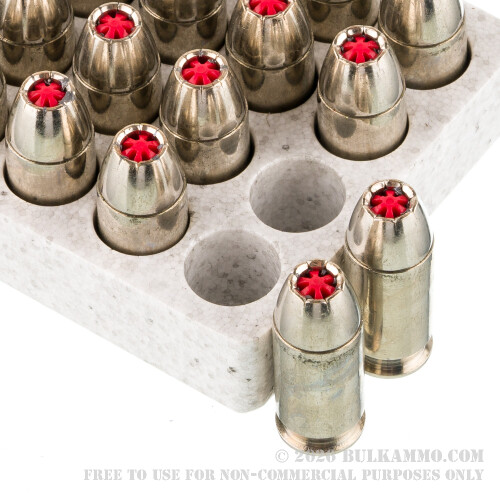 This cartridge is decked out with a middleweight 200 grain jacketed hollow point. That 30 grain weight reduction amounts to a faster muzzle velocity without added unwanted chamber pressure, so you’ll see a flat trajectory that punches hard on impact. The JHP’s rim is imprinted a symmetrical array of notches that allow it to break apart evenly during penetration of soft tissue. But the bullet’s most noticeable feature is its Hex-Vent – a hard polymer insert which keeps the nose cavity free and clear of fabric and other obstructions before it can supply wide and uniform terminal expansion.