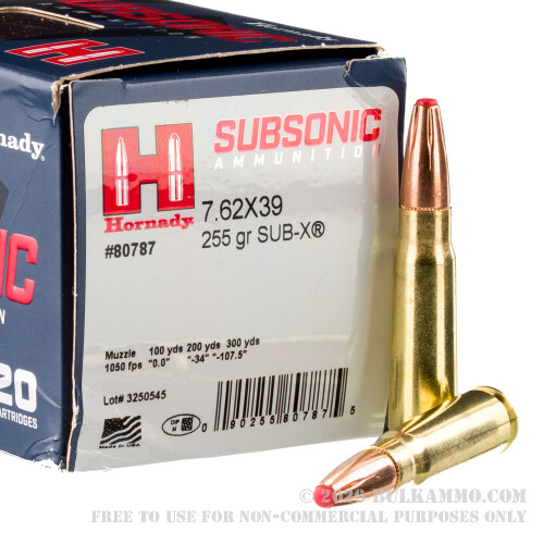 Hornady Subsonic 7.62x39mm ammo is … subsonic! This round’s 255 grain bullet is far too ponderous to break the speed of sound. If it hops out of a 20” barrel, then its muzzle velocity will be 75 fps lower than sonic! That makes these rounds the bee’s knees if you’re trying to hunt without making too much of a fuss, or you intend to defend your homestead with a suppressed firearm because you’d prefer not to deafen yourself if you can avoid it.