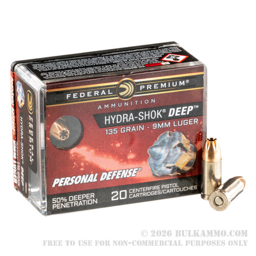 This 9mm cartridge from Federal’s Hydra-Shok Deep line of ammunition features a 135 grain jacketed hollow point projectile. Like the original Hydra-Shok, this bullet features a center post which prevents its cavity from clogging with fabric and other types of barriers upon impact. That design has been improved, however, by making the post more robust so that it can resist even more substantial barriers. This bullet is designed to reliably penetrate 15 inches deep in soft targets, a depth recognized by the FBI as ideal for self-defense -- it makes overpenetration that would jeopardize a bystander significantly less likely to occur.