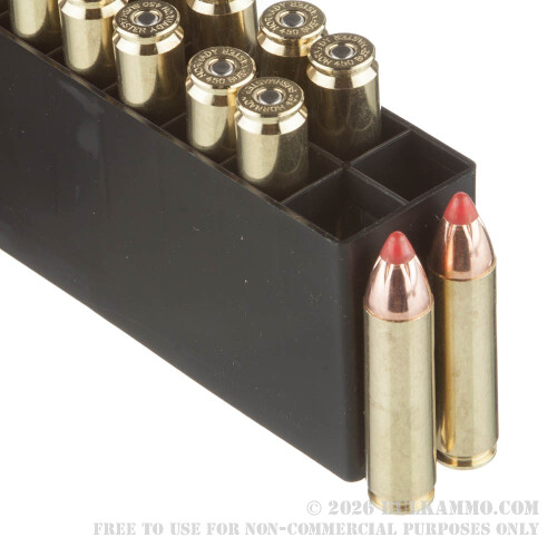This round features Hornady’s 250 grain FTX projectile. It is an accurate bullet thanks to its secant ogive profile, concentric jacket, and pointed Flex Tip. The FTX’s polymer tip works to initiate massive expansion as it rapidly wedges within its core upon impact. The bullet creates a wide and deep wound channel, and exhibits superior weight retention while doing so thanks to the InterLock ring which locks its one-piece high antimony lead core and heavy jacket together. A well-placed 250 grain FTX is certain to bring down even the most rugged of American beasts.