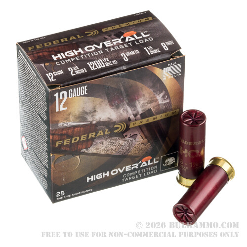 25 Rounds of 12ga Ammo by Federal High Over All - 1 1/8 ounce #8 shot