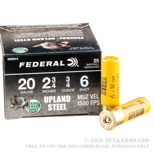250 Rounds of 20ga Ammo by Federal Upland Steel - 3/4 ounce #6 steel shot