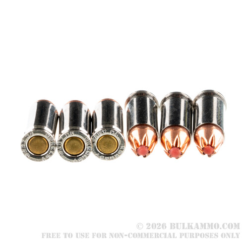 Want to give your easily concealed 25 ACP pistol the reliable stopping power it needs to neutralize a threat quickly? Then Hornady’s Critical Defense line of ammunition provides just what you need in the form of this handy little cartridge. This round’s 35 grain bullet is an FTX, which has got a Flex Tip to initiate rapid expansion upon impact. That polymer pillar further prevents the hollow in the FTX’s nose from plugging up with fabric, preserving its ability to expand. During expansion the FTX’s heavy jacket and high antimony lead core remain locked together courtesy of their InterLock ring, enabling the FTX not only to widen greatly but to penetrate deeply as well.