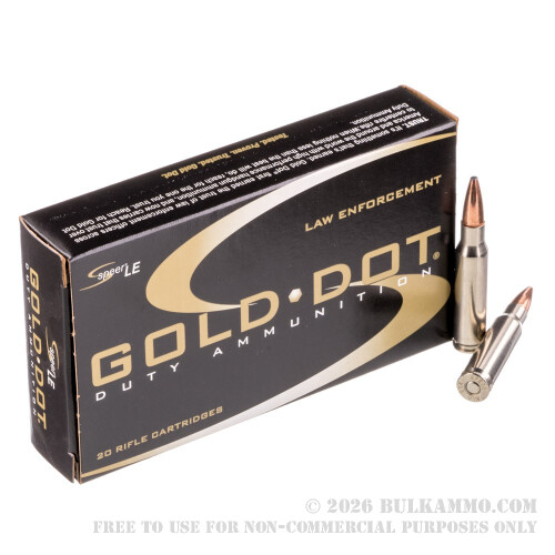 Federal’s Speer LE (Law Enforcement) Gold Dot Duty Ammo is at the top of the list when it comes to high quality firearms ammunition. Since their introduction, Speer Gold Dot bullets have lead the industry in design, consistency, and terminal performance When you load up with Speer Gold, you know you can count on your ammo performing. This Gold Dot .308 Win load comes with a 168 grain Gold Dot Soft Point (GDSP) bullet that is copper plated and has a lead core. The cartridge also features a thick-walled, reloadable, non-corrosive Boxer primed nickel coated brass case.