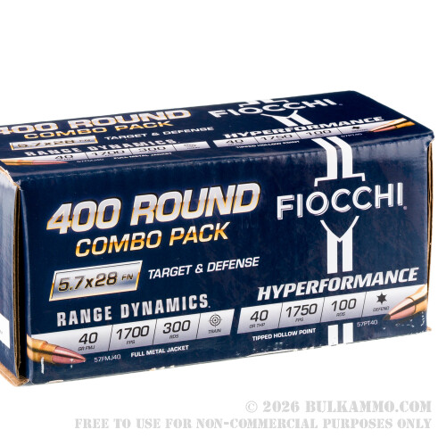 400 Rounds of 5.7x28mm Ammo by Fiocchi Combo Pack - 40gr FMJ & 40gr THP