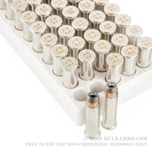 The Jacketed Hollow Point bullet is housed in a protective copper jacket that will not lead foul your barrel, and increases the weight retention of the round in excess of 98% over jacketless soft point lead bullets.