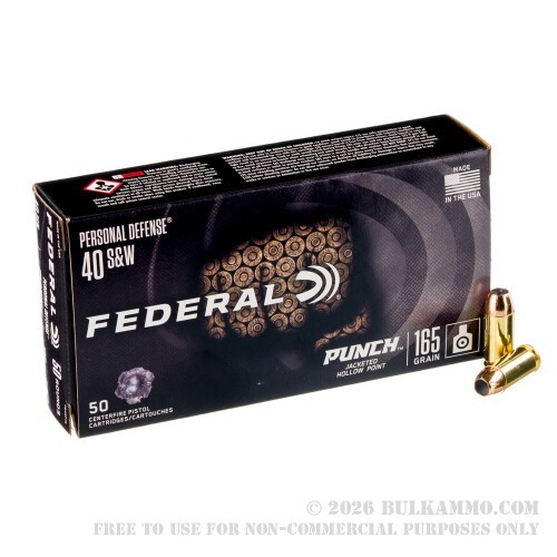 Federal Premium loads Punch series 40 S&W ammunition for civilian defense. The “Punch” in this instance takes the form of a 165 grain jacketed hollow point: light enough to take supersonic flight out of Federal’s 4” test barrel, and designed in such a fashion that triggers powerful expansion. More damage to the threat. Less risk of damage to bystanders. The perfect package.