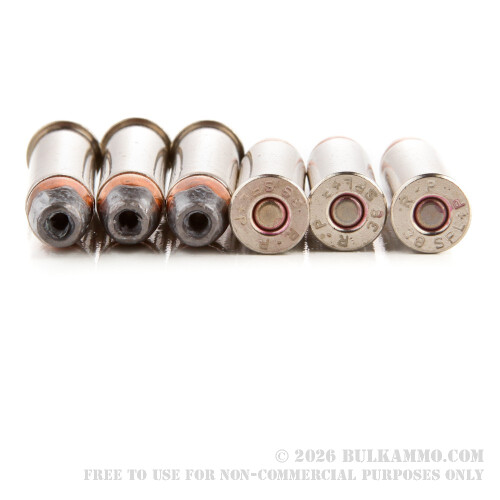 This round’s brass casing features nickel plating. It reduces friction to make the round easier to slip in and out of a cylinder, and helps to protect against corrosion that could impact performance. Shiny nickel even makes ammo easier to see and work with in the dark!