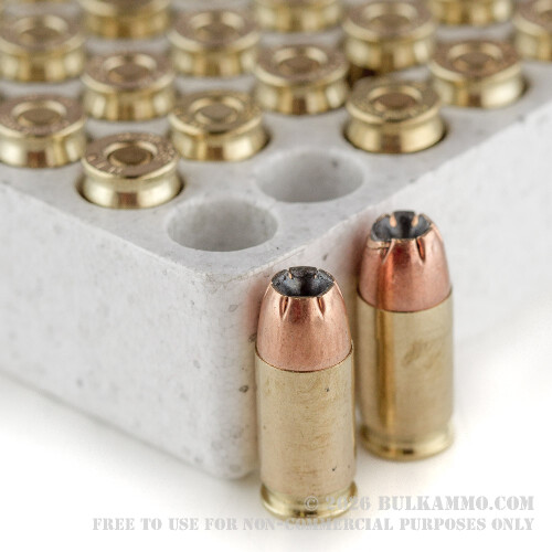 This round features its caliber’s heavyweight 95 grain projectile, so it inherently possesses the ability to penetrate deeply. The bullet wears a jacket that not only promotes proper feeding in a semi-automatic, but which is concentric for in-flight rotational stability and tough to facilitate penetration. As the bullet travels through its target, its hollow point nose cavity deposits great energy while widening to produce a crippling wound channel. Even for its small caliber, this is a potent bullet indeed.