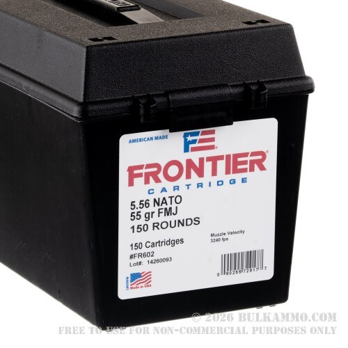 Frontier ammunition is loaded with new military-style brass cases (reloadable) and Boxer primers (noncorrosive). This ammo is packaged in black plastic field boxes. A nice touch! Looks much better in storage that way.