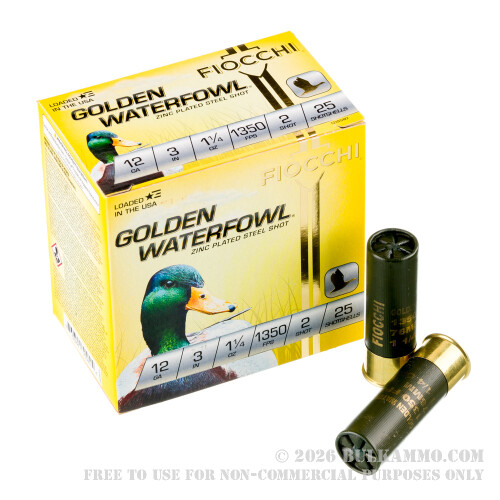 Fiocchi’s Golden Waterfowl line of high quality waterfowl loads in 12 gauge gives you the versatility you need when you’re out on the marshlands hunting a variety of birds including geese and duck. The 3” shells and the #2 shot gives you an excellent change of taking more birds, without causing irresponsible shots to be taken or bad results from poor density and poor payload delivery.
