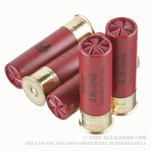 A quality 12 gauge turkey load that offers a heavy payload and a great history of reliability. Part of the turkey specific line “Strut Shok” by Federal, this is among the better performing truly traditional type turkey loads that emphasize a single shot size and a magnum payload to dispatch your trophy turkey. Such is the case here: this is a #5 shot 1 7/8 ounce payload that should offer sufficient power out through to about 30 yards on most turkeys. The 3” Magnum load is built for excellent reliability in feeding and extraction in the semi-automatics that are so popular now in turkey hunting, and the high brass base will assist in this matter.