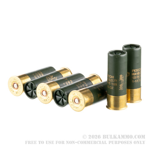 Buy a few boxes of these 12 gauge high velocity shotshells from Fiocchi for your next bird or small game trip. These 2-3/4" shells fire a 1 1/5 ounce load of #8 lead shot at an above-average muzzle velocity of 1,330 feet per second, enabling you to make quick, clean kills at greater distances.