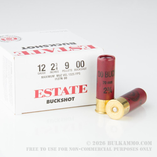 Hunters will appreciate the low cost, high power, and effectiveness of this 12 gauge buckshot load from Estate. Each 2-3/4" shell in this bulk priced case of 250 fires 9 pellets of 00 buck at a muzzle velocity of 1,325 feet per second, putting this ammunition in the "express" category. This ammo will produce good patterning, though at the cost of substantial recoil. A great choice for close encounters with deer and other thin skinned game!