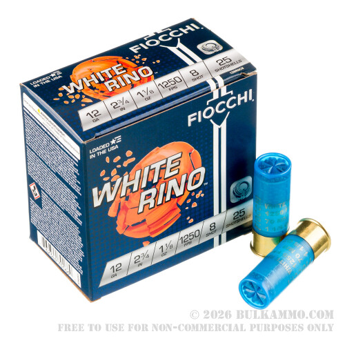 250 Rounds of 12ga White Rhino Ammo by Fiocchi - 1 1/8 ounce #8 shot