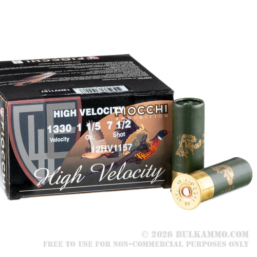Fiocchi presents their High Velocity line of shotshells to discerning hunters and shooting enthusiasts who understand that great performance is attainable from their shotgun ammunition without having to pay a needlessly high price for it. This 12 Gauge shotshell’s high brass hull, reliable primer, even burning powder, and uniformly round top-level chilled shot come together to create an ideal shooting solution, and true to its name its 1,330 fps muzzle velocity gives it the ability to easily compensate for even the fastest birds’ flight speeds.