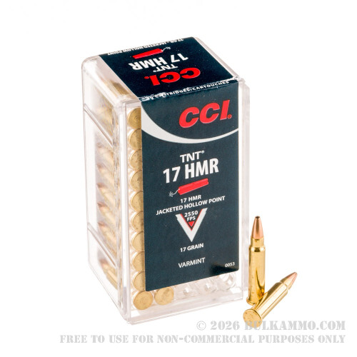 If you want to put critters on the table, put CCI’s TNT hollow points in your mag. This jacketed hollow-point round is the first of its kind in .17 HMR and offers “dynamite” performance against raccoons, prairie dogs, rabbits, squirrels and other varmints. TNT cartridges fire a light 17-grain bullet at an extraordinary muzzle velocity of 2550 feet per second for massive expansion on impact.