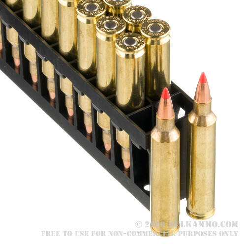 The round as shown here produces 4225 feet per second velocity out of the muzzle and 1268 pound feet of energy from the bore and ensures that any varmint end up dead for anywhere between 50 and 500 yards if they come in contact with the 32 grain VMAX projectile coming out of this Ruger .204.