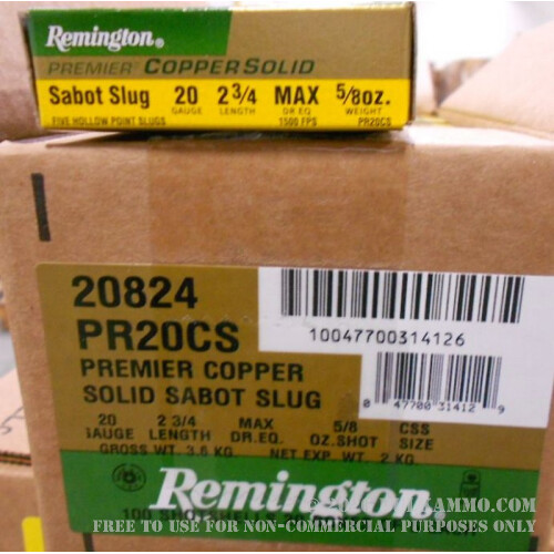 5 Rounds of 20ga Ammo by Remington - 5/8 ounce Copper Solid Sabot Slug