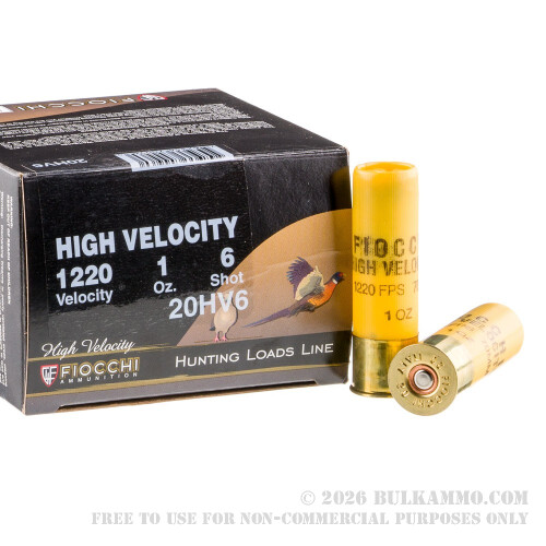 This 20 Gauge shell by Fiocchi Munizioni is loaded with one ounce of #6 lead shot. With 225 of these .11” diameter pellets, this shotshell is a well-balanced choice for hunting birds of various sizes, even those that tip the scales toward the turkey range. With an approximately foot wide kill zone at 35 yards, you’ll be able to take squirrel and hare with ease as well as this shot reliably penetrates their little hides.