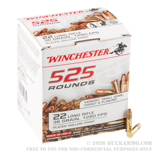 525 rounds of Winchester 36 grain copper-plated hollow point 22 LR ammo will strike fear into the hearts of squirrels everywhere! The typical muzzle velocity on a 36 gr .22 LR round is 1,328 ft/s. Winchester has spent over 100 years refining their rimfire process, and each cartridge is subject to dozens of quality control checks and must meet specific specifications to reach the market.
