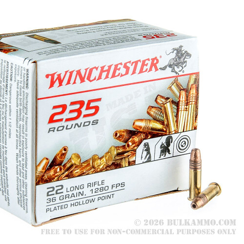 The 22 Long Rifle cartridge has been around since 1887 and was designed by the J. Stevens and Arms company as a way to bridge the gap between 22 Long and the 22 Extra Long rounds. Winchester 22 LR 36 grain Copper Plated Hollow Point rounds have brass cases that are rimfire primed and reloadable with the proper specialized rimfire reloading equipment. They have a muzzle velocity of 1280 feet per second. These Winchester packs of 235 rounds provide you with a moderate amount ammo for various purposes, while still being easily affordable. The suggested uses are Target shooting, plinking, small game and varmint hunting. Shore up your 22 LR ammo supply and grab 4 or 5 boxes today. Winchester/Olin Corporation rounds are proudly made in the USA.