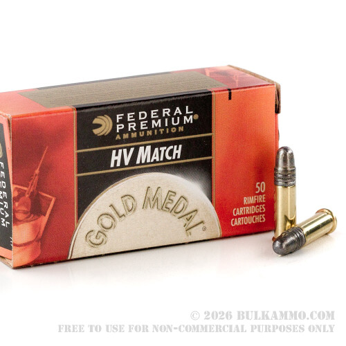 This Federal Premium Gold Medal HV Match 22lr ammunition is topped with 40Â grain, all lead, solid round nose bullets. These bullets are loaded into new, reloadable (with the right equipment), polished, Non-corrosive primed, brass, rimfire cases. The muzzle velocity of these 22LRs is 1200-feet per second, and they sport 128-foot pounds of muzzle energy. These are the ideal round for shooting competitions, handgun matches, and off-hand target shooting. These Federal rimfire loads come in packs of 50 rounds, easily recognized by the Black and Orange-Red look of the Gold Medal boxes. Get a case or 2 now to make sure you have enough 22LR in your armory.