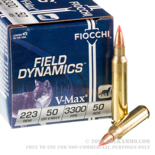 Fiocchi's 223 ammo loaded with 50 grain V-Max projectiles made by Hornady is a great combination. This ammo achieves accuracy that comes close to rivaling match grade accuracy at a fraction of the price. Whether you're looking for a very accurate round or are planning on going out West on a prairie dog hunt, this ammo is a great choice. The V-Max bullets are designed to fragment on impact making them very effective at dispatching small game and other varmints.