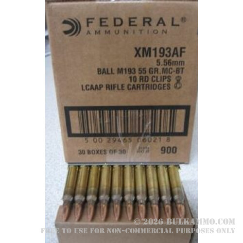 900 Rounds of XM193 5.56x45 Ammo by Federal - 55gr FMJBT Loaded on Stripper Clips