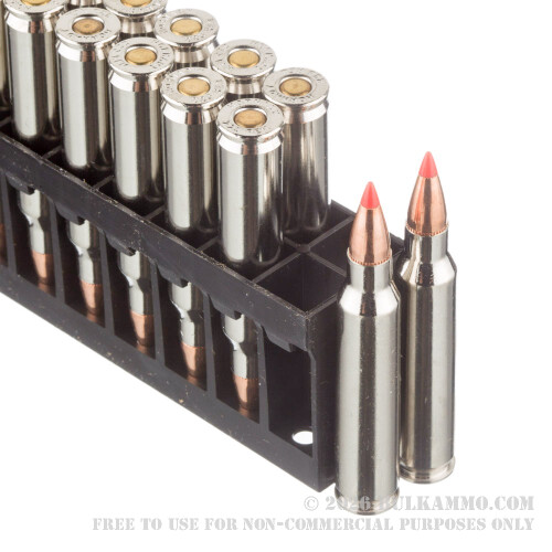 These are the 55 grain TAP FPD (Tactical Application Police – For Personal Defense) polymer tipped projectile and they are loaded in front of an extremely clean burning powder charge that offers sufficient ballistics with a brass casing, coated in nickel and Boxer primed for reloadability. This tactical ammo reaches 3240 feet per second velocity and 1282 pound feet of energy at the muzzle.