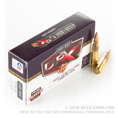 Whether you're securing your home from predatory animals or home invasions, this Corbon DPX ammo is a solid choice. As .223 Remington cartridges, these rounds deliver about 12-17 inches of penetration and will defeat various light barriers such as sheet metal and vehicle windows. Each cartridge in this box of 20 fires a 62 grain solid copper hollow point at 2,750 feet per second from a 16 inch barrel.