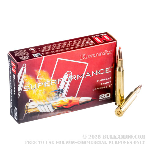 This 270 Win cartridge from Hornady’s Superformance line of ammunition features a 130 grain GMX projectile. The bullet’s mono-metal copper alloy construction means that it shoots far more cleanly than lead, and also that it will not separate so it will retain 95 percent of its weight during penetration. (Additionally, this bullet’s composition makes it fine for use in areas where toxic ammunition has been banned.) The GMX sports a polymer tip to streamline its shape and initiate expansion of up to 1.5 times the bullet’s original diameter, giving you the devastating terminal performance you need to take down game fast.