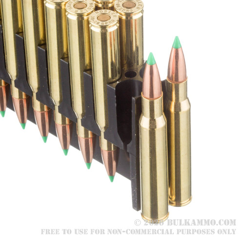 This 30-06 Spring cartridge by Nosler sports a 180 grain Ballistic Tip projectile. It features a streamlined polymer tip that not only resists deformation in your rifle’s magazine, but also initiates expansion upon impact with the target. This bullet’s fully tapered jacket is perfectly fitted to its special lead alloy core, permitting controlled expansion as well as optimal weight retention at practically any velocity for a deep, damaging wound channel. This bullet’s base is heavily jacketed, which promotes large diameter mushrooming. Its solid base has a boat tail design, which substantially increases the bullet’s accuracy and ballistic coefficient, and additionally helps it resist cross winds while in-flight. The culmination of this bullet’s technology makes it absolutely devastating against deer and hogs.