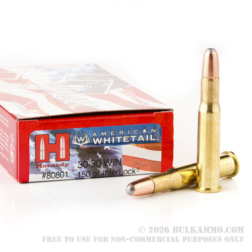 These .30-30 rounds come equipped with a 150-grain round nose projectile, in boxer-primed, noncorrosive reloadable brass cases. These rounds are great for deer, or even larger game up to 300 lbs and come 20 cartridges per a box.