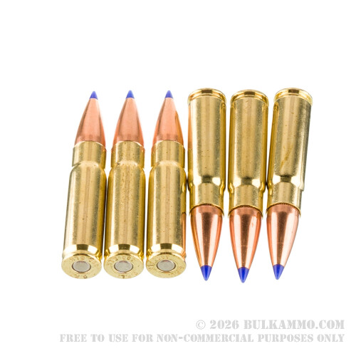 This 125 grain ammunition utilizes Super Shock Tip (SST) bullet technology to effect an impressive ballistic coefficient with low drag. The polymer at the tip of the bullet prevents deformation upon firing, but still allows for round expansion upon impact, creating a very versatile tactical round. It has a muzzle velocity of 2,200 fps and a muzzle energy of 1,343 ft-lbs and is considered tactically effective up to 500 yards. The brass casings are Boxer-primed and non-corrosive, manufactured by Fiocchi for reliability and to be a reloadable option for dedicated marksmen.