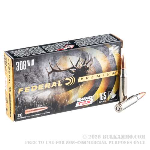 This 308 Win cartridge by Federal Premium features a 165 grain Barnes Triple-Shock X-Bullet (TSX). Because the TSX is completely made of copper, it can’t experience core-jacket separation upon impact, so it delivers superior weight retention for deep penetration. By virtue of its copper construction the TSX also causes far less barrel fouling, and is acceptable for use in areas where lead ammo is banned, including California. This bullet expands during penetration to produce four razor sharp cutting petals, so it creates a devastating wound channel for fast stopping power. The TSX further features multiple rings cut into its shank to reduce pressure and significantly improve its accuracy.
