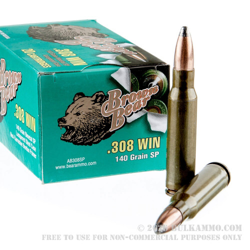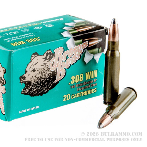 Great bargain hunting and target .308 ammunition from the Brown Bear line with the lacquer coated steel casings and the soft point 140 grain bullet, this is a real bargain for those that just want to shoot their .308 without worrying about their mortgage payment.