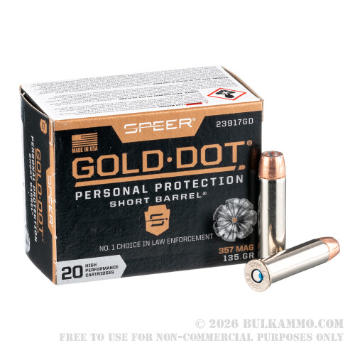 You will receive 20 Rounds of .357 Mag Ammo by Speer Gold Dot Short Barrel - 135gr JHP