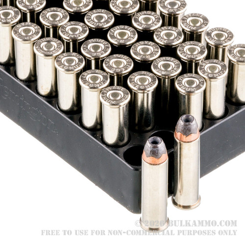 A partially jacketed hollow point with exposed lead tip and a gorgeous nickel plated brass cartridge case makes this a great looking cartridge. The projectile is a fast moving, deep penetrating high deformation bullet that weighs in at a classic 158 grain weight. The muzzle velocity is 1230 feet per second and the muzzle energy is 525 Ft. Lbs. of energy. These numbers make it an easy contender for those who want to shoot the same ammo they carry. Adequate penetration is an understatement. The penetration on these rounds is exceptional, especially given the propensity for the uniform expansion of the projectile with the semi jacketed design. Finally, to make this purchase an obvious one, the price is low for what you get. Not only are you getting the best production quality Remington can produce but your ballistics are ridiculously good, given the money it costs to purchase the rounds.