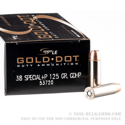 These .38 special + P 125 grain jacketed hollow points are boxer-primed and are law enforcement grade. This case of Speer .38 special ammunition contains 20, 50 round boxes.