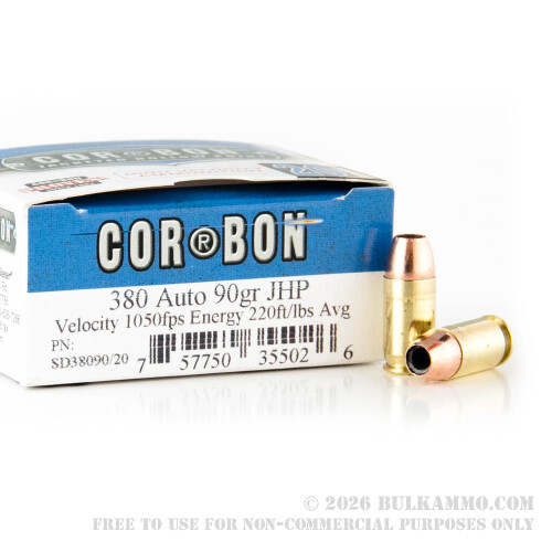 These rounds are loaded into noncorrosive, boxer-primed reloadable brass cases. Each box of .380 ACP from Corbon contains 20 rounds.