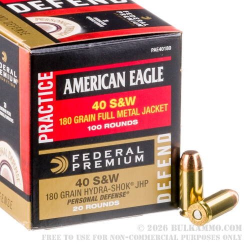 Grab a combo pack or two from Federal for a one stop solution to your .40 S&W ammunition needs. This pack contains 100 rounds (2 boxes of 50) of inexpensive but reliable Federal American Eagle FMJ target ammo and 20 rounds of Federal Premium 180 Hydra-Shok JHP self-defense cartridges.