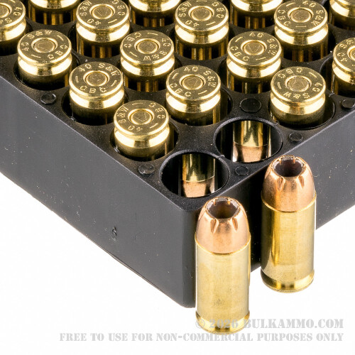 Magtech .40 S&W cartridges are perfect for cost-conscious shooters looking for reliable range and self-defense ammo. A popular self-defense cartridge, this 40 S&W ammo features a 180gr jacketed hollow point (JHP) bullet that transforms into a mushroom shape as it strikes a target. With a muzzle velocity of 990 fps and a corresponding energy transfer of 393 ft/lbs, the JHP has the power and capacity for expansion to serve as a good self defense tool.