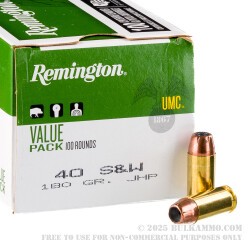Priced for both range and self-defense use, these .40 S&W cartridges from Remington UMC are a great general purpose load for Glocks, XDs, M&Ps, and other .40 caliber pistols. Each cartridge in this box of 100 is loaded with a medium weight 180 grain jacketed hollow point bullet of a simple design that offers significantly increased terminal effectiveness over FMJ rounds.