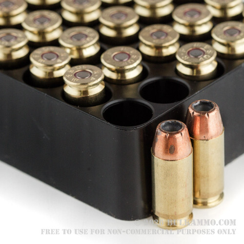 This round sports a 180 grain jacketed hollow point projectile. Its jacket serves to ensure that the round feeds reliably in a semi-automatic pistol, and also controls the massive expansion provided by the bullet’s hollow point. Working in conjunction with this round’s fast 1,015 fps muzzle velocity, this cartridge lives up to the claim that it will really deliver when used for personal protection.